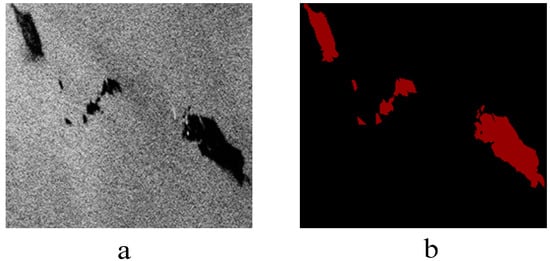 - Segnet is a supervised pre-training process, and a label should be made for each sample. In Figure 2b, the black area represents the background (seawater) and the red region represents the target (oil slicks or lookalikes).