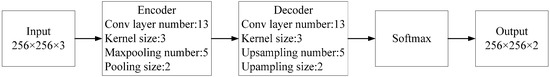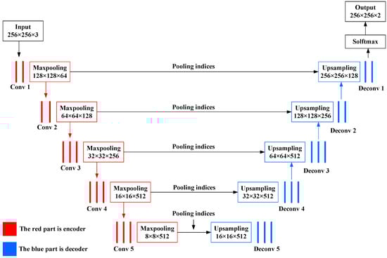 Segnet is a deep convolution neural network with a sound performance of image semantic segmentation [17]. The basic framework of Segnet is an encoder and a decoder. The most important components of Segnet include a convolution layer, pooling layer, up-sampling layer, and softmax layer, see Figure 3. The encoder consists of the convolution layer, batch normalization layer, and rectified linear unit (ReLU), and its structure is similar to the visual geometry group (VGG)-16 network [22]. The convolution layer is the main component of the encoder, and each output pixel is only linked to the local area of the next input layer, thus forming a local receptive field [23]. The decoder consists of a transposed convolutional layer and an up-sampling layer, and its structure is symmetrical to that of the encoder. The convolution layer corresponds to the transposed convolution layer and the max pooling layer corresponds to the up-sampling layer [24]. At the end of the decoder, the category of each pixel is output through a softmax layer.