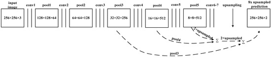 Three end-to-end FCN models (i.e., FCN32s, FCN16s, and FCN8s) were proposed by Long et al. [14], among which FCN8s (8-step sampling) was considered the best one. The FCN8s encoder includes convolution layers with a convolution kernel. The convolution layers changed from the last three full connection layers are convolution kernels of , , , and the convolution layers of layers 6–7 are all characteristic images . The last de-convolution layer can be considered as an up-sampling process, which can be used to obtain the segmentation image with the same size as the original image. The up-sampling process of FCN8s is a jump architecture, which performs up-sampling on the results of different pool layers of pool 3, pool 4, and pool 5, and then optimizes the output according to these results. The size of the output picture was the same as that of the input, and its number of channels was 2, which indicates that the output prediction picture contained two categories (seawater and oil slicks). A schematic diagram of FCN8s’ model operation is given in Figure 9.