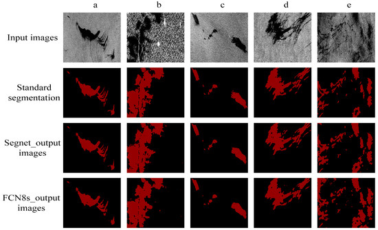 The comparison between Segnet and FCN8s is shown in Figure 11, and the five samples (a–e) represent the boundary statuses, respectively (see Table 3). The results show that FCN8s has a good overall segmentation effect. However, the performance needs to be improved in oil spill images with weak boundaries and high boundary complexity. The Sample-d and Sample-e are both high wind speed regions in Figure 11. Due to the high wind speed, the oil slick boundary complexity in Sample-d was high, and the segmentation results were not ideal.