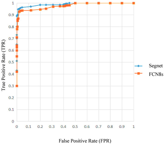 The receiver operating characteristic (ROC) analysis was used to evaluate the proposed algorithm with the pixel classification accuracy of FCN8s. Since our model input was a sample containing both oil slicks and seawater, it was difficult to ensure that the pixel ratio of oil slicks and seawater was 1:1. To ensure that the pixel ratio of oil slicks and seawater was as close as possible to 1:1, we re-selected the training set and the testing set. According to the label of each sample in the training set, the number of pixels of oil slicks and seawater in each sample was calculated, respectively, and finally, 2800 pieces of data with the pixel-to-pixel ratio of oil slicks and seawater of 0.998:1 were selected. The testing set selected 200 test data with a ratio of 0.989: 1 from 600 testing sets. The ratio of the training set to testing set was still 6:1. The ROC curves for Segnet and FCN8s are shown in Figure 12, and we can see that the ROC curves of Segnet and FCN8s are very close to the upper left corner, but there are still some differences. Under the condition of a high false positive rate (FPR), both showed a higher true positive rate (TPR). However, under the condition of low FPR, the TPR of FCN was lower than that of Segnet. The results show that Segnet has achieved a moderate TPR in the whole range of FPR.