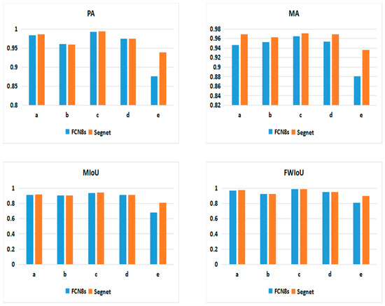 We compared the performance of FCN8s and Segnet from the following four aspects: Pixel-classification accuracy (PA), mean accuracy (MA), mean intersection over union (MIoU), and frequency weighted intersection over union (FWIoU). The comparison of the four standard values for FCN8s and Segnet with five boundary statuses (see Table 3) is shown in Figure 13. It can be observed that the performance of Segnet and FCN8s for the first four boundary statuses was almost the same, and the PA was above 95%. However, for Status-e (Weak boundary strength), Segnet was superior to FCN8s in the segmentation effect, and the PA of Segnet reached 93.92%. FCN8s performed slightly worse for weak boundary segmentation, achieving 87.53% of PA. Thus, that Segnet can effectively detect dark spots (oil slicks or lookalikes) in SAR images.