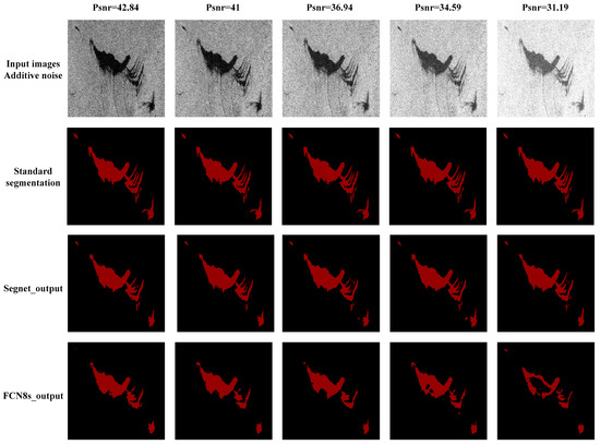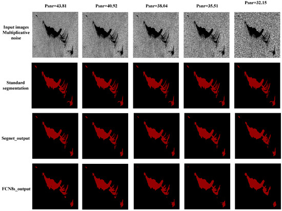 Due to the influence of the sea surface environment (such as waves, ocean currents, and low wind belts) and the characteristics of SAR sensors, high noise and weak boundaries are commonly found in SAR images of oil spill. Figure 14 shows an example of the segmentation effect of a test sample at five additional noise levels. The first row is a SAR test sample with five different peak signal-to-noise ratio (PSNR), and the second row is the label of each sample. The outputs of Segnet and FCN8s are listed in the third and fourth rows, respectively. Figure 15 shows the segmentation effect of the same test sample at five multiplicative noise levels.