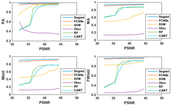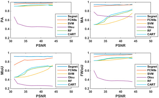 Correspondingly, the effectiveness of the proposed method is demonstrated through the analysis of some experimental results. The same training set and test set were applied to FCN8s and some classical image segmentation methods, such as SVM, CART [27], RF [28], and Otsu. The four aforementioned evaluation parameters (PA, MA, MIoU, and FWIoU) at 10 additive noise levels are shown in Figure 16, and a comparison at 10 multiplicative noise levels is shown in Figure 17, where the X coordinate is PSNR. We can see the following trend: