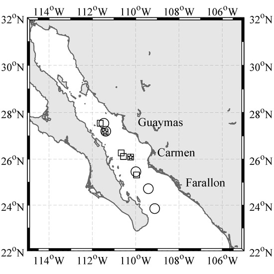 - Lavín, M.F.; Marinone, S.G. An overview of the physical oceanography of the Gulf of California. In Nonlinear Processes in Geophysical Fluid Dynamics; Velasco Fuentes, O.U., Sheinbaum, J., Ochoa, J., Eds.; Springer: Dordrecht, The Netherlands, 2003; pp. 173–204. [Google Scholar]