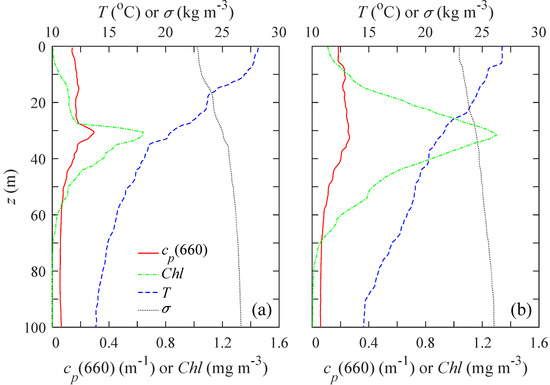 Our measurements show that the bio-optical properties within the Gulf of California exhibited a large range of variability, which is summarized in terms of Chl and cp(660) data in Table 2. The examined water column extended from the surface to a maximum measurement depth of 80 m. The depth of euphotic layer, zeu, was determined using a conventional criterion by estimating a depth at which the surface PAR (i.e., EoPAR) was reduced to 1%. The depth zeu ranged from about 30 to 60 m depending on time and location of measurement. Typically, our measurements (at least in the blue-green spectral region) extended ~10–30 m below zeu, and these maximum measurement depths corresponded to ~0.1–0.5% of surface EoPAR. Because phytoplankton have specific energetic demand rather than demand for percentage of light, it is reasonable to expect that the compensation depth of phytoplankton photosynthesis for specific latitude, season, and optical water types investigated in our study was greater than zeu, probably closer to 0.1% of surface PAR [87]. Therefore, we refer to the entire investigated water column as the euphotic layer.