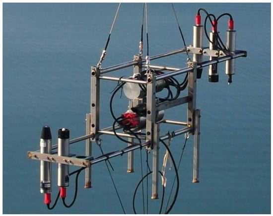 Underwater radiometric measurements, including the irradiance quartet, Ed, Eu, Eod, and Eou (for all stations) and upwelling zenith radiance Lu (for a few stations in 2011), were collected using an instrument package equipped with five RAMSES sensors (TriOS Mess- und Datentechnik GmbH, Rastede, Germany). Concurrent in-air downwelling plane irradiance, Es(λ), was also measured with an additional sensor mounted on board the ship. These sensors typically acquired signal over the approximate spectral range 320–950 nm (with slight difference among sensors) with ~3.3 nm spectral interval across the spectrum. The radiance sensor had a 20° field of view in air. All five in-water sensors were mounted on a common frame and aligned to the exact same depth level (Figure 3). The in-water package was lowered into water from the sun-exposed side of the vessel at a distance of ~15 m from the vessel to minimize ship-induced light field perturbations [80,81]. Vertical profile measurements were taken at several discrete depths from a few meters below the surface to depths of 50 to 80 m depending on the station. The package was stopped and held every 3–10 m to acquire 5–10 spectral scans at each measurement depth. The integration time of each sensor was automatically adjusted to the light intensity at each measurement depth to ensure an adequate signal to noise ratio. The depth resolution of discrete measurements was highest near the surface and decreased to 10 m below the 20 m depth. Generally, at least one measurement was made near the depth of the Chl maximum as indicated by the chlorophyll-a fluorescence profile from the CTD cast.