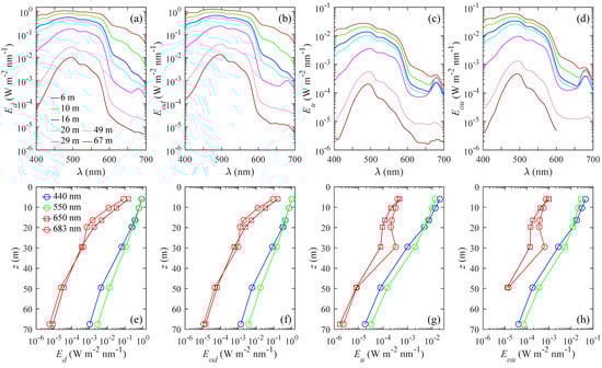 Spectra and vertical profiles of the irradiance quartet, Ed (a,e), Eod (b,f), Eu (c,g), and Eou (d,h), measured at the station in the Guaymas Basin shown in Figure 2a. In panels (a–d) different colors represent the measurement depths as indicated in (a). In (e–h) different colors and symbols represent selected light wavelengths as indicated in (e).