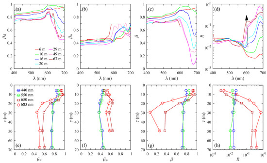 Spectra and vertical profiles of average cosines of underwater light field, (a,e), (b,f) and (c,g) as well as irradiance reflectance, R (d,h), derived from the irradiance quartet for Guaymas Basin shown in Figure 4. In panels (a–d) different colors represent depths as indicated in (a). The black arrow in (d) indicates a spectral feature caused by Raman scattering of water molecules. In (e–h) different colors and symbols represent light wavelengths as indicated in (e).
