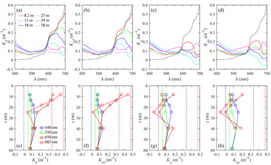 Figure 6 shows the attenuation coefficients for the four irradiances, specifically Kd, Ku, Kod, and Kou, as derived from the measurements of irradiance quartet, Ed, Eu, Eod, and Eou, respectively. Similar to other AOPs discussed above, the K-coefficients were less variable in the blue-green than in the red portion of the spectrum, both in terms of the spectral shape (Figure 6a–d) and vertical profiles (Figure 6e–h). One of the most remarkable features was that the K-coefficients in the red (more specifically for λ > 580–600 nm) were generally smaller than the pure water absorption coefficient, aw. This feature resulted from inelastic processes and was more pronounced for Ku and Kou than Kd and Kod. In the chlorophyll-a fluorescence band, Kd and Kod approached zero in the upper portion of the Chlmax layer (Figure 6e,f), which is consistent with an earlier observation that Ed and Eod are nearly constant within that layer (Figure 4e,g). A stronger effect within the 683 nm band was observed for the Ku and Kou coefficients that assume negative values in the upper portion of the Chlmax layer (Figure 6g,h). This is again consistent with the measurements of Eu and Eou which both increased with depth within that layer (Figure 4f,h). Similar increase of Eu in the red band (685 nm) with depth within the Chlmax layer was previously observed by Dirks and Spitzer [37]. The presence of negative values for the attenuation of upwelling irradiance was also demonstrated through RT simulations of light field within highly scattering near-surface layer of bubble clouds entrained by wave breaking [91]. Other interesting features of the long-wavelength portion of K-spectra include a maximum at 683 nm below zChlmax (for all K-coefficients, see Figure 6a–d) or a maximum that could peak at wavelengths longer than about 600 nm but shorter than 683 nm at depths above zChlmax (especially for Kd and Kod, see Figure 6a,b). These features arise from differential spectral effects of inelastic processes as a function of increasing wavelength. It is also interesting to note that a distinct feature at these intermediate depths was observed in the spectra of and (Figure 5b,d). This can be explained by higher attenuation coefficient leading to more light concentrated around the vertical direction.