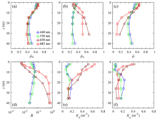 Vertical profiles of average cosines, irradiance reflectance, and diffuse attenuation coefficients for the station in the Farallon Basin shown in Figure 2b. Data for panel (a); (b); (c); R (d); Kd (e); and Ku (f) are shown for selected light wavelengths as indicated in panel (a).