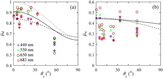 It has long been recognized that at near-surface depths in relatively clear ocean waters, the downwelling radiance distribution, and hence , are strongly dependent on the sun position in clear sky or more generally on sky conditions, for example clear skies vs. overcast skies [11]. Such sensitivity of the downwelling average cosine to surface illumination conditions cautions against its indiscriminate use as a general descriptor (in the sense of AOPs) of water bodies, especially in the surface layers, and emphasizes a need for specifying surface boundary conditions. Our data collected within the top 10 m layer in the Gulf of California support the general trend of a decrease in near-surface with increasing solar zenith angle regardless of light wavelength (Figure 8a). For comparison, the best fit lines to experimental data of Aas and Højerslev [94] obtained at a 5 m depth (Mediterranean Sea) in the blue (465 and 474 nm) and experimental data of Lewis et al. [29] at a 5 m depth (open ocean waters in the Pacific) in the green (555 nm) are also shown in Figure 8a. In contrast, our data of at near-surface depths did not exhibit a clear dependence on the solar zenith angle (Figure 8b). We note, however, that Aas and Højerslev [94] and Lewis et al. [29] suggested a very weak dependence based on their data, as indicted in Figure 8b.