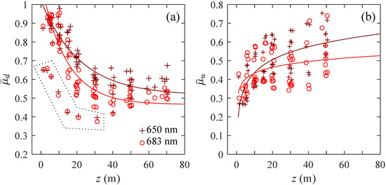 The increased role of inelastic processes, especially Raman scattering, with increasing depth is illustrated for the average cosines in the red part of the spectrum in Figure 9. This effect was particularly well-pronounced for the downwelling light field in terms of a well-behaved trend of a decrease in with increasing depth towards = 0.5, which is clearly seen in our data at the two examined wavelengths in the red, 650 nm and 683 nm (Figure 9a). The best-fit exponential functions to the data are:
