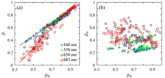 Similar patterns observed in our data of and (e.g., Figure 5) indicate that these two average cosines were well correlated. The relationships between and obtained with our data are presented in Figure 10a. Specifically, the linear relationship for the blue-green spectral region as determined from the data collected at various depths and two wavelengths, 440 nm and 550 nm, is: