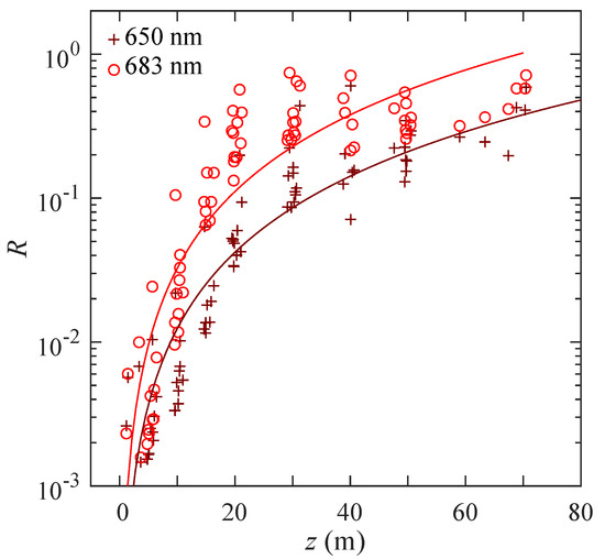 As emphasized before, the increasing role of inelastic processes with increasing depth is most significant in the long-wavelength part of the spectrum. This effect is clearly seen in our data of R plotted as a function of depth for wavelengths of 650 and 683 nm (Figure 11). Both R(650) and R(683) showed gradual increase from the values of the order of 10−3 near the surface to more than 0.1 within the mid- to deep portions of the examined water column. These data suggest that depth can serve as a useful proxy for the vertical changes in R in the red part of the spectrum. The best-fit exponential functions to the data are: