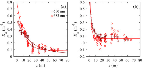 Diffuse attenuation coefficients in the red spectral bands (650 and 683 nm) plotted as a function of depth z using data from all stations and depths. (a) Kd(z, 650) (crosses) and Kd(z, 683) (open circles) vs. z. (b) Same as (a) but for Ku. Solid lines represent the best-fit regression functions.