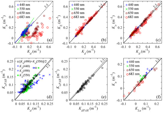 These relationships indicate that reasonably good estimates of can be obtained from downwelling irradiance measurements. As seen, and in the blue-green were typically close to one another within the examined euphotic layer. In the red, the correlation is marginally lower and still very strong but tends to be somewhat smaller than over a nearly complete data range with the exception of the highest values.