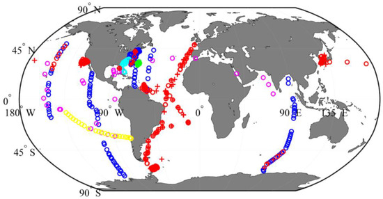 In situ data distribution, the (o) are the stations for quantitative filter technique (QFT) aph(λ) from SeaBASS, (o) and (+) are the subset_1 and subset_2 stations of matchups of aph(λ) and HPLC from SeaBASS, (o) is the HPLC location for BATS (Bermuda Atlantic Time-Series Study), (o) are the BIOSOPE Rrs(λ), aph(λ) and HPLC locations, (o) are locations of the Rrs(λ), aph(λ) and HPLC from VIIRS val/cal cruises in 2014 and 2015, and (o) are the locations of Rrs(λ), aph(λ) and HPLC from Tara Oceans expedition.