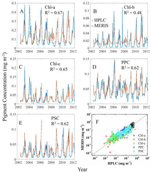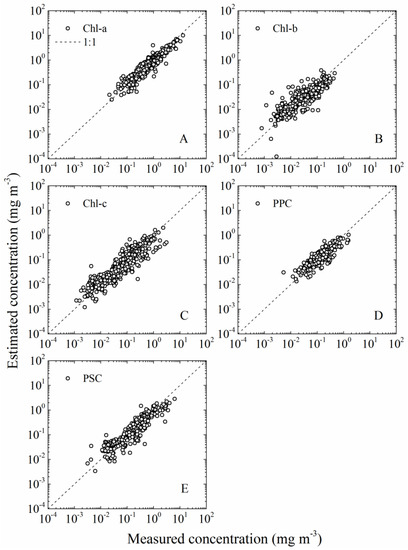 Empirical approaches have been the most widely used to obtain information for two or more pigments. Similar to the empirical relationships used by NASA for the estimation of [Chl-a] from Rrs(λ) [4], Pan et al. [45] developed empirical relationships between High-Performance Liquid Chromatography (HPLC) measured pigment concentrations and Rrs(λ) for coastal waters in the northeast coast of the United States. Moissan et al. [46] directly used satellite-derived [Chl-a] as model input to retrieve other pigments in the Atlantic Ocean off the east coast of United States with the underlining assumption that all accessory pigments co-vary with chlorophyll a.