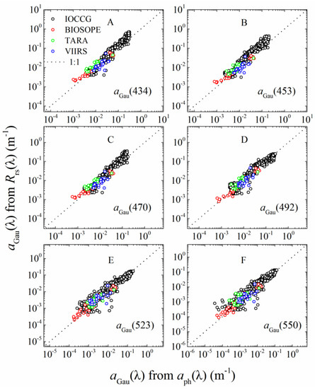 The MuPI model was first tested with datasets that contained different levels of chlorophyll a concentration from the IOCCG synthesized data and different cruises in the global ocean. The main purpose of this test was to evaluate, and validate, the implementation of the MuPI approach for a wide range of environments. A mean UAPD of 36% was obtained between aGau(λ) from Rrs(λ) inversion and aGau(λ) from water samples throughout the data range for different datasets (see Figure 3). The differences in statistical results, noted in Table 5 for aGau(λ) retrieval from different datasets, are strongly influenced by their different dynamic ranges and characteristics as implied in Section 2.1.