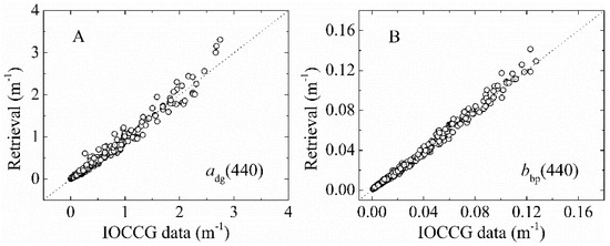 MuPI retrieved adg(440) and bbp(440) versus those from the International Ocean-Colour Coordinating Group (IOCCG) dataset.