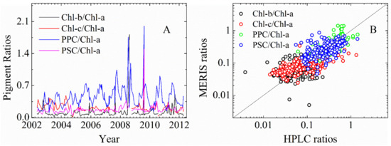 Beyond the seasonal cycles in Cpig magnitudes, variation in pigment composition over time implied in the change of pigment ratios was also noticed in Figure 6A. On further examination, we found the ratios derived from MERIS Rrs(λ) using MuPI can pick up the variation in the [Chl-b], [Chl-c], [PPC], [PSC] to [Chl-a] ratios observed from HPLC measurements very well with the mean UAPD of 50%, 47%, 25%, 37%, and median of 38%, 39%, 19% and 29% respectively (Figure 6B). Since these phytoplankton pigment ratios do not co-vary with the [Chl-a] product and cannot be empirically estimated from [Chl-a] alone, the Gaussian peaks and multiple pigments retrieved here provide a valuable glimpse into potential applications of these ratios in ocean changes that can be studied at large spatial and high temporal scales.