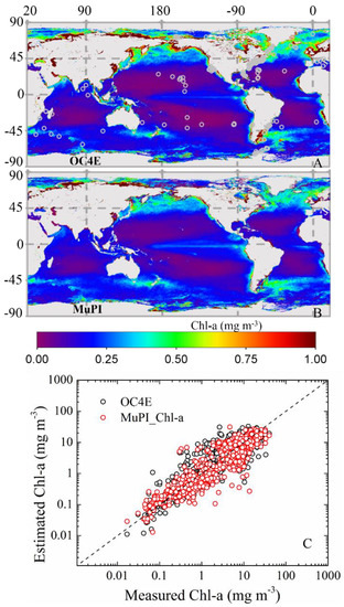 The basin-scale [Chl-a] distribution follows the pattern reported in the literature [4,5]. In comparing the global map of [Chl-a] derived in this study with the standard product from NASA ocean color website (Figure 7), some differences were noticed. In the previous section, when using HPLC data from BATS for validation, the retrieved [Chl-a] showed higher accuracy via MuPI than that from the standard OC4E algorithm. To better understand the differences in [Chl-a] distribution at the global scale, a validation dataset from SeaBASS was used. This dataset was obtained by searching match-ups of in situ measured [Chl-a] with those from MERIS Rrs(λ). A dataset containing 608 pairs of [Chl-a] and MERIS Rrs(λ) were obtained in which [Chl-a] concentrations ranged from ~0.017 to ~40.3 mg∙m−3 (locations shown in Figure 7A). In comparing the estimated [Chl-a] from two different methods with in situ measurements (Figure 7C), MuPI and OC4E showed comparable results with mean UAPD of 48.8% and RMSE of 4.51 mg∙m−3 for OC4E and mean UAPD of 49.3% and RMSE of 4.05 mg∙m−3 for MuPI. As shown in Figure 7C, the [Chl-a] estimated from OC4E is biased slightly high (~10%) in the range of 1–10 mg∙m−3 compared with results from MuPI. This range of [Chl-a] (1–10 mg∙m−3) is mainly from coastal and inland waters for which the influences from colored dissolved and detrital matter result in lower accuracy in band-ratio estimated [Chl-a] [80]. For several samples, the [Chl-a] values from MuPI are biased low (~70%) as shown in Figure 7C. There are two possible reasons for this: (1) bad input MERIS Rrs(λ), not only the values but also the spectral shape, especially at the blue bands that are susceptible to poor atmospheric correction, where negative values are often observed for coastal waters [81]; (2) the limitation of the algorithm as a result of the empirical parameters used to reduce the unknowns in MuPI, and the low contribution of aph(λ) to the total absorption coefficients in the 400–750 nm range, which will be further discussed in Section 4.