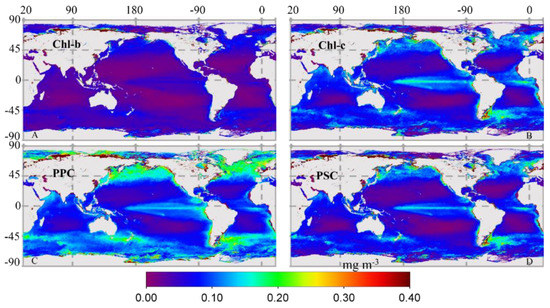 The pigment ratios to [Chl-a] showed complicated patterns (Figure 9). In high [Chl-a] regions, [Chl-b]/[Chl-a] and [PPC]/[Chl-a] are low. In some low [Chl-a] regions, the ratios of [Chl-c]/[Chl-a] and [PSC]/[Chl-a] are relatively high, such as in the East Pacific Ocean. These results agree with previous findings about the global distribution of phytoplankton groups and pigment ratios, as lower [PPC]/[Chl-a] ratios correspond to high [Chl-a] and larger particle size [9,17,82,83,84]. As recorded in the literature, in different regions of the global ocean, the quality and quantity of light and nutrient, as well as temperature, is highly variable [85]. These highly unpredictable and rapid changes of the environment usually result in phytoplankton taxonomic composition variation (long-term adaptation) or physiological acclimation (short-term acclimation) [24]. The variation in pigment ratios obtained from MuPI can directly reflect these changes in phytoplankton and provide valuable information for phytoplankton studies in large spatial and high temporal scales.