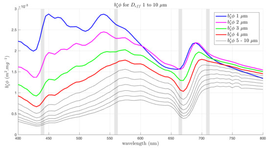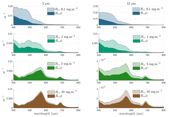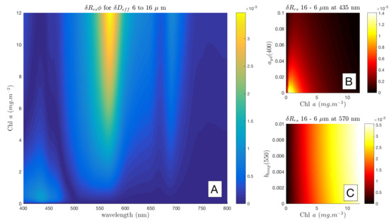 Absorption-based pigment differences are therefore sensitive to scattering variability unless the biomass is very high, and this is particularly relevant in spectral regions affected by scattering variability due to changes in (Figure 4). Noting the log-scale Chl a axis of Figure 9, it can be observed that while the respective magnitudes of the pigment-driven ( = 12 m, Figure 9) and size-driven ( from 6 to 16 m, Figure 4) signals are comparable at the point that pigment differences appear (i.e., 10 mg·m), the size-driven feature is more sensitive at lower biomass—detectable at around 2 mg·m for the given change in . This sensitivity will be affected by the size range in question and also by pigment concentrations, but it can be inferred that, generally, where size changes of this range (or larger) take place together with pigment changes, it is the size change that drives the variability in the water-leaving signal, and changes in the reflectance due to a substantial change in are observable at lower biomass than those due to pigment changes.