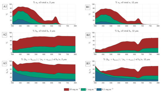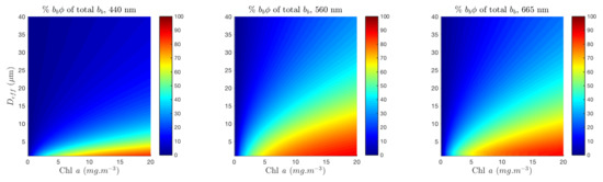 For each , it is evident that the phytoplankton percentage contribution to the bulk increases with biomass. However, it can be seen that there is a dependency on which, when considered in the context of transitioning assemblages, is not straightforward. This observation indicates a requirement to go beyond the Case 1/Case 2 water type distinction for PFT signal analysis and applications: the differential in phytoplankton scatter as varies in both water types must be considered as well as variable in Case 2. When it comes to retrieving information about the phytoplankton IOPs, their proportional contribution to the bulk water-leaving signal (or the total IOPs) should be considered. Figure 2 demonstrates the proportional IOP contributions for the 0.1, 1 and 10 mg/m cases.