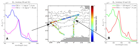 Figure 3 presents two distinct events which illustrate the interdependency of the size and biomass signals. Modelled are shown for selected adjacent stations (20 to 21 is marked A; 12 to 13 is marked B) where a nominal threshold of change detectable by satellite is reached in the blue and green spectral regions, in other words, where a change in would be evident on a satellite image. Given the ambiguity in the causality of the phytoplankton signal, assessing the magnitude of changes to the water-leaving signal as the in-water constituents vary will give an indication of whether there may be enough radiometric signal at TOA to even detect the change. A threshold in situ measurement resolution of 1 × 10 sr [80] is taken as an indication of sensitivity to detecting change in by direct measurement. Given an average estimated uncertainty in satellite of ± 0.6 × 10 sr across the spectrum [81], here a conservative 1 × 10 sr is used to indicate a potentially detectable change in water-leaving signal from satellite. These thresholds are not definitive and are used purely for the purpose of contextualising the discussion. Both examples in Figure 3 display large changes in , but these are causally distinct: (A) represents a large change in Chl a concentration and in , while (B) represents a large change in Chl a concentration but a negligible change in .