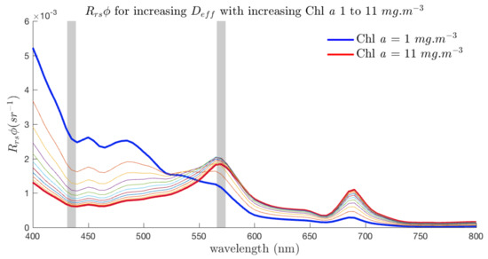It should be noted that the spectral locations of maximum features are a direct consequence of the spectral nature of the IOPs used in the modelling, and that both of these examples use the same Chl a-carotenoid refractive indices to generate the phytoplankton IOPs. In other words, as phytoplankton IOPs are adjusted to represent pigment differences, the spectral character of the assemblage change will vary. A slight migration in the exact location of the maximum available signal is observable with different ranges of , although within the Chl a-carotenoid group it remains between 550 and 600 nm for any difference in between 1 and 40 m. (This is discussed in more detail later with respect to Figure 9, and an additional figure is shown in Appendix.)