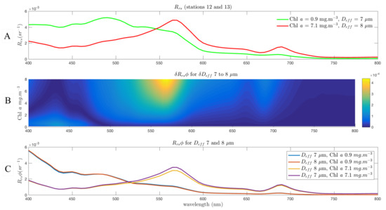By contrast, stations 12 to 13 exhibit a large change in —seen first in Figure 4B; shown again in Figure 6A—with an increase in Chl a from 0.9 to 7.1 mg/m but only a very small change in from 7 to 8 m. This is likely, given the location in the lee of the South Sandwich Islands, to reflect a diatom bloom associated with island wake effects, due to fertilisation by terrestrial iron [82]. Tracing the signal due to this change in across all Chl a concentrations in this range in Figure 6B shows that there is a size related signal between 550 and 600 nm, but it is of an order of magnitude less than in the previous example, and so does not show potential for detection by satellite radiometry. This is illustrated further in the lower panel (C), showing the location of this signal but also that it is almost all attributable to biomass—as shown by the representing 7 at 7.1 mg/m i.e., what the higher biomass would look like without the increase in effective diameter as the assemblage changes. It can be seen quite clearly from these spectra that a difference in the blue due only to this , with any variability , would not be detectable by any means.