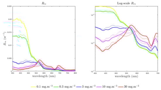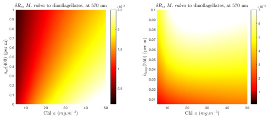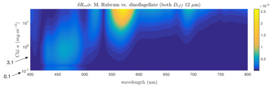 Both the phycoerythrin-containing and peridinin-containing assemblages are modelled here, Figure 7 and Figure 8) with of 12 m, so the simulated optical changes as the assemblage changes from M. rubra-dominated to dinoflagellate-dominated are all due to differences in pigmentation, for any given Chl a concentration. From the log-scale it is evident that the pigment-related differences in become larger as biomass increases. In the very high biomass blooms (≥30 mg·m) typical of the Benguela system, it is known that M. Rubrum—containing assemblages are identifiable from MERIS satellite imagery [83] due to the effects of the diagnostic phycoerythrin peak (at 565 nm) appearing in the 560:520 nm band ratio.