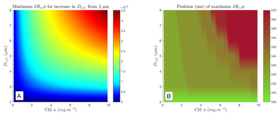 Maximum for from a starting assemblage with 2 m, as Chl a varies (A). Note that the occurs at different wavelengths from 500 to 600 nm (B), and this shows the maximum signal, so there is no exact wavelength information in (A). Using a difference of 1 × 10 sr as a threshold for detection by satellite, it can be seen that, while the maximum size change here (2 to 8 m) is not detectable with Chl a < 1 mg/m, by 10 mg/m, even a small change in results in a detectable change in .