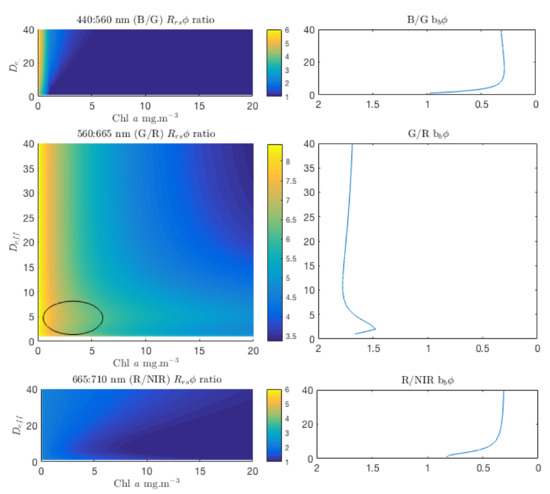 To further test the sensitivity of the EAP model and the causal IOP variability in terms of identifiable changes in spectral shape from a multi-spectral perspective, ratios for 440:560 nm (blue:green), 560:665 nm (green:red) and 665:710 nm (red:NIR) wavelengths were calculated for a range of and biomass.
