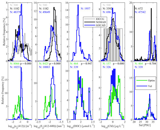 Geographic locations of GOCAD field stations overlap with NOMAD stations (Figure 3). We can see that many of the NOMAD stations were ultimately excluded from GOCAD during the quality assurance analysis described in Section 2.2. Highlighted in the central panel of Figure 3 are those stations with high-quality in situ radiometry, which were set aside for tuning, training, and optimization of ocean color algorithms. The geographic distributions of both the training data and the validation data show a representational combination of stations from both offshore and nearshore waters, which theoretically improves the odds of being able to retrieve a broad dynamic range of bio-optical properties, although as pointed out above the optimization data appears to be slightly dominated by oceanic stations. It is clear from Figure 3 that while there is significant overlap in the CDOM and DOC datasets in certain regions such as northern Alaska and the mid-Atlantic Bight in the Northeastern U.S., globally they follow a somewhat different pattern, and many DOC field stations are not obviously represented in the CDOM dataset.
