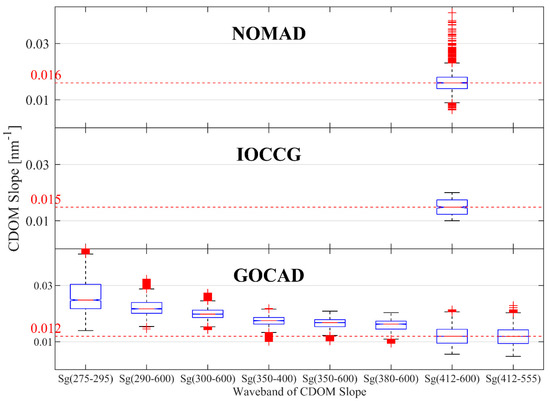Exponential slope of CDOM in NOMAD, IOCCG, and GOCAD. Median values for S412–600 are highlighted in red for comparison. NOMAD and IOCCG lack UV CDOM.