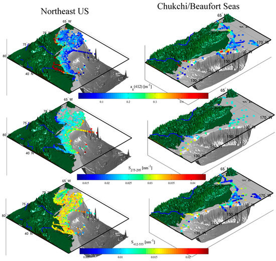 The dense concentrations of field stations sampled in relatively smaller regions such as the Northeastern U.S. are difficult to resolve at the small scale in Figure 3. Figure 4 shows three-dimensional maps of select sub-regions with ag(412), Sg(275–295), and Sg(412–555), including the Northeast US and coastal Alaska between the Chukchi Sea and the Beaufort Sea. These are set in broad continental shelves with numerous nearby river outflows. Not surprisingly, CDOM is high throughout the regions shown in Figure 4 with low spectral slope in the UV. CDOM and Sg(275–295) increase and decrease, respectively, in close relation to distance from shore, as expected given the considerations discussed in Section 1.2 and elsewhere. Variability is higher for spectral slope in the VIS (Sg(412–555)), but it generally follows the opposite pattern from that in the UV, i.e., decreasing with distance from new sources of CDOM. This is indicative of aging processes as the newly mobilized, near-shore CDOM mixes seaward and photo- and microbial degradation reduce absorption in the UVA relative to the UVB (thus increasing Sg(275–295) and relative to the VIS (thus decreasing Sg(412–555)). It may indicate marine sources of CDOM with chromophores that absorb in the UVA and blue rather than terrestrial sources that also absorb in the UVB. These patterns are perhaps clearest at the outflows of the Colville River (~135º W and 70º N) and the Chesapeake Bay (~77º W and 37º N). An interesting exception for Sg(412–555) can be found in the Gulf Stream transect (~70º W and 37º–40º N; GOMECC-2 experiment, Table 2), where slope increases upon entering the productive waters at the edge of the Gulf Stream despite a lack of CDOM increase, and then rapidly declines upon entering the oligotrophic waters south of the Gulf Stream.