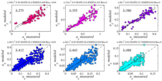 where β0–β4 are the regression coefficients, Y is the retrieval parameter, and λ1–λ4 are the sensor-specific wavelengths (i.e., 443, 488, 531, and 547 nm for MODIS, 443, 490, 510, and 555 nm for SeaWiFS). Using monthly, binned L3 Aqua imagery for 2010, MLR retrievals were used to establish the 99th percentiles for each retrieval waveband of ag. Retrievals above these values were considered outside the scope of this global algorithm, and eliminated. Regression coefficients, statistics, and thresholds are presented in Figure 5, and Table 3, Table 4 and Table 5. Model retrievals plotted against field data are well organized about the 1:1 line with low scatter, particularly in the UVA, which is reflected in high correlation coefficients and low error and bias. MAPD is below 30% for all bands below 488 nm; from this band to higher wavelengths, the CDOM signal becomes very weak in most of the global ocean.
