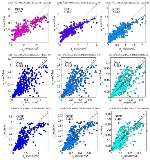 Due to a paucity of ad(λ) and bbt(λ) observations in GOCAD, this relationship was tuned for multiple linear regression using the IOCCG synthetic dataset (r2’ = 0.76, RMSD = 0.07, bias = −0.004 m−1, MAPD = 75%, N = 464). ag(410) was expanded using Equation (1) to other wavebands with the empirical retrieval for Sg(412–555) (derived as per Equation (8) and Table 4). Regression statics for the optimization data are shown for the QAA and GIOP in Figure 6, with slightly better results in the GIOP. Although the current version of GOCAD is less well populated with some optical properties than others (i.e., data collection targeted carbon-related properties and only included others if they happened to be in the same SeaBASS file), the digital structures for each property mentioned in this section are included in the database, and future algorithm investigation (particularly using SAAs) would greatly benefit from incorporation of these data into GOCAD or a similar, climate-scale, global database.