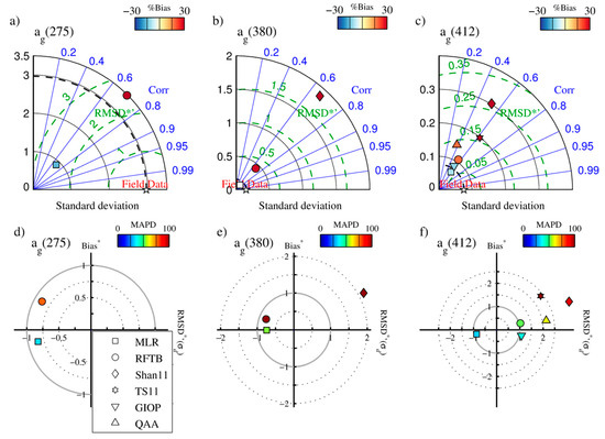 Semi-analytical approaches included the Quasi-Analytical Algorithm of (QAA) [5,63,64], and the Generalized Inherent Optical Property (GIOP) algorithm [65]. These have the advantage that they are based on theoretical models for how the light field is affected by the inherent properties of the water, but can only retrieve IOPs at those wavebands for which Rrs(λ) is measured (i.e., they do not extend into the UV for the current and historical suite of satellite sensors). In the future, however, data from GOCAD and elsewhere could be used in the development of linear matrix inversion-type semi-analytical algorithms including basis vector models extending into the UV for CDOM, thereby potentially enabling their retrieval directly using SAAs. In fact, using GOCAD to build more globally representational basis models extending CDOM into the UV may not only provide better retrievals of CDOM, but also of the other concurrently retrieved optical properties from linear matrix inversion. Both the GIOP and QAA invert the Rrs(λ) to retrieve the water column IOPs following the theory that sea surface reflectance at a given wavelength is proportional to the backscattering coefficient, and inversely proportional to the absorption coefficient [16,66]. Each uses various assumptions, empirical parameterizations, and mathematical inversion techniques to solve for the IOPs and partition them into their constituents. These include the total backscattering coefficient, bbt(λ), backscattering by particles, bbp(λ), absorption by total particles, by phytoplankton, and by the combination of non-algal particles and CDOM, adg(λ) = ad(λ) + ag(λ), where ad(λ) is non-algal (or detrital) absorption). These latter properties are similar in spectral shape, and therefore difficult to partition, which presents a challenge if we wish to compare the retrievals of SAAs to the other algorithms presented here. Therefore, while we do not re-develop or re-optimize the SAAs here—using them as published—we do utilize GOCAD to facilitate the separation of dissolved and detrital absorption components. Specifically, we solve for ag(λ) by assuming that ad(λ) is a function of the combined backscattering by water, non-algal particles, and the dissolved absorption by CDOM, which we assume does not backscatter, although there is some evidence supporting backscattering by colloids [46]. These SAAs retrieve only the combined bbp(λ) from phytoplankton and non-algal particles, but the latter tend to have a higher refractive index, and therefore contribute far more strongly to the backscattering signature, e.g., [67] and references therein. An empirical relationship was developed between ad(410), bbt(550) and adg(410), and then ag(410) was found by subtracting ad(410) from SAA retrievals of adg(410):