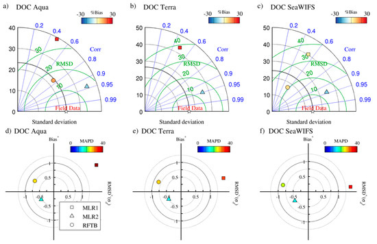 - Tehrani, N.; Sa, E.; Osburn, C.; Bianchi, T.; Schaeffer, B. Chromophoric dissolved organic matter and dissolved organic carbon from sea–viewing wide field–of–view sensor (SEAWIFS), moderate resolution imaging spectroradiometer (MODIS) and meris sensors: Case study for the northern gulf of mexico. Remote Sens. 2013, 5, 1439–1464. [Google Scholar] [CrossRef]