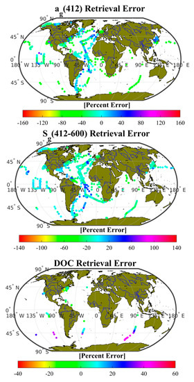 A representational suite of approaches, including empirical, semi-analytical, and machine-learning algorithms was evaluated against GOCAD field data for retrieving ag in six wavebands between 275 and about 490 nm, Sg in eight wavebands in the UV and VIS, and DOC using a wide variety of metrics. Ultimately, the most versatile and best performing of those tested was a simple, empirical set of relationships based on multiple linear regression between four wavebands of remote sensing reflectance (440–555 nm), with the exception of DOC which also required sea surface salinity (e.g., from Aquarius) to act as a proxy to optical water type. Results varied, with CDOM retrievals showing regression coefficients to field data (r2) generally over 0.80 for field radiometry to within 16%–34%, depending on the wavelength, and within 33%–54% for MODIS Aqua validation. CDOM slopes retrievals were best in the UVB (e.g., r2 = 0.62, MAPD = 11% in satellite validation of Sg(275–295)), while DOC algorithms only optimized well after the inclusion of salinity (r2 = 0.91, MAPD = 15%), and did not perform well in validation (e.g., RMSE = 27–29 μmol L−1). Our analysis of the sensitivity of the DOC algorithm performance to factors such as salinity, DOC, water column depth, and geographic location ultimately proved inconclusive, exposing only a small anomaly involving overestimates of DOC in the southern oceans using MODIS Aqua imagery. Further validation—particularly in mid–ocean gyres where DOC varies very weakly or not at all with CDOM absorption, and salinity changes are very small—is clearly warranted prior to application of the DOC algorithm in those regions.