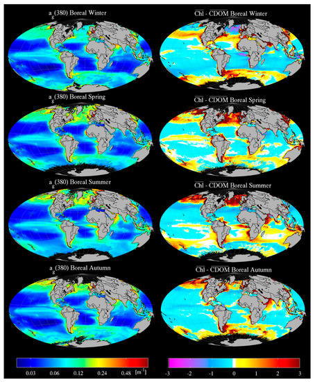 MLR retrievals of ag(380) by season over the entire MODIS Aqua era (left column), and residuals between Chl and CDOM (right column). Imagery was binned from 4 km resolution monthly composites between August 2002 and January 2014.