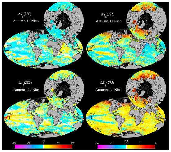 CDOM anomaly (left) and slope anomaly (right) from MLR applied to MODIS Aqua during Autumn in El Niño years (2002–2005; top panel) and La Niña years (2007, 2008, 2010, 2011; bottom panel). The Western Pacific Crescent (WPC) feature is defined here as the broad region exhibiting a notable decline in CDOM during El Niño years, and enhancement during La Niña. UV slope shows the opposite pattern, with lower slopes during La Niña, although the percentage change is roughly an order of magnitude lower. The box shows the portion of the WPC subsampled for comparison with MEI (See Figure 14).