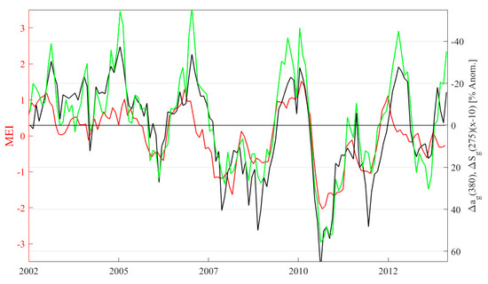 Multivariate ENSO Index (MEI, in red), CDOM anomaly at 380 nm (black), and UVB slope anomaly (green, scaled by a factor of −10 for clarity) over the entire MODIS Aqua era for the region of interest highlighted in Figure 13. Strong negative and positive correlations exist between MEI and CDOM and slope anomalies, respectively (see text).
