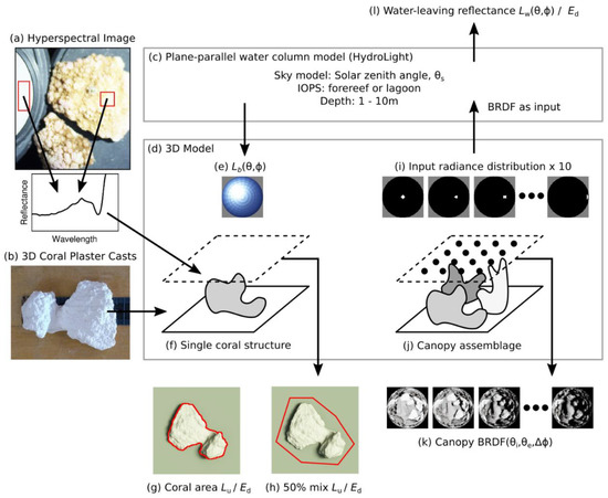 - Mixtures of 3D living coral structures were assembled on flat dead coral rock substrate, in areal cover densities from 39% to 75%. The 3D model was used with horizontal periodic boundaries to generate a canopy BRDF function, which was then used as a bottom boundary condition in HydroLight (Figure 1i,j). By this method, spectral water-leaving reflectances derived as water-leaving radiance at a given wavelength (λ) normalized to downwelling planar irradiance (Lw(θ, Δφ, λ)/Ed(λ)), could be derived above the water for different view directions under different solar zenith angles and water column conditions (Figure 1l). Incorporating the water column this way spatially averages the results, and scope of the results corresponds to pixels larger than the coral structures, i.e., pixels ≥ 1 m, since the coral structures were less than 20 cm across. This modelling covered the same range of depths, solar zenith angles, and the two IOP treatments mentioned above. This aspect of the work corresponds to activities 5 and 6 in Table 1.