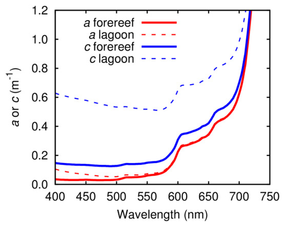 Total absorption, a(λ), and attenuation, c(λ), as used in the two water column inherent optical property (IOP) treatments, forereef and lagoon (includes the contribution of pure water itself).