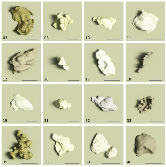 To capture the shape of each field-sampled coral, they were impressed into silicone rubber putty after imaging and the moulds were allowed to air dry. These moulds were transported back to the University of Connecticut; each mold was filled with plaster to recreate the coral shape (Figure 1b). Digital 3D models of the plaster cast of natural corals were created using Autodesk ReCapTM photogrammetry software (version 5.0.1.30). The process involved taking between 20 and 40 overlapping photographs of the plaster corals and converting them into 3D digital models consisting of a mesh of vertices and triangular surface polygons. Then, the 3D models were edited in Autodesk® MeshmixerTM (version 3.4.35) to isolate the coral shape from the background. For each coral, two models were produced: High resolution, ranging from 50,000 to 200,000 triangles, and low-resolution, typically ~2000 triangles (Table 1). The low-resolution models are computationally easier to handle, and the first intended test was to determine if low-resolution models would be sufficient. For interpretation of results, a surface rugosity measure [20] was calculated for each coral shape, being the ratio of the coral surface area to its projected area (i.e., nadir view areal extent) in the high-resolution models.